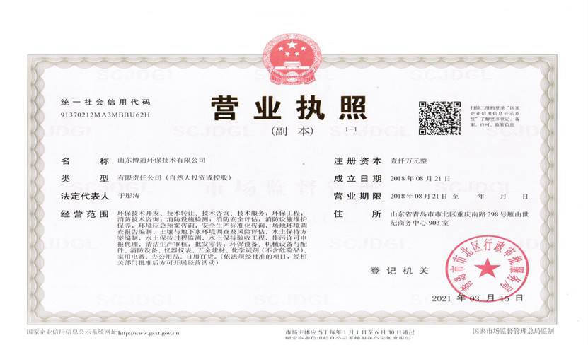 山東博通環(huán)保技術有限公司是一家專業(yè)從事環(huán)保、安全、消防的多元化技術服務公司,公司致力于打造專業(yè)的技術服務團隊,立足青島,輻射山東,服務范圍涵蓋:環(huán)保技術開發(fā)、技術轉讓、技術咨詢、技術服務;環(huán)保工程;消防技術咨詢;消防設施檢測;消防安全評估;消防設施維護保養(yǎng);環(huán)境應急預案咨詢;安全生產標準化咨詢;場地環(huán)境調查報告編制,土壤與地下水環(huán)境調查及風險評估,水土保持方案編制,水土保持過程監(jiān)測,水土保持驗收工程,排污許可申報代理,清潔生產審核;...